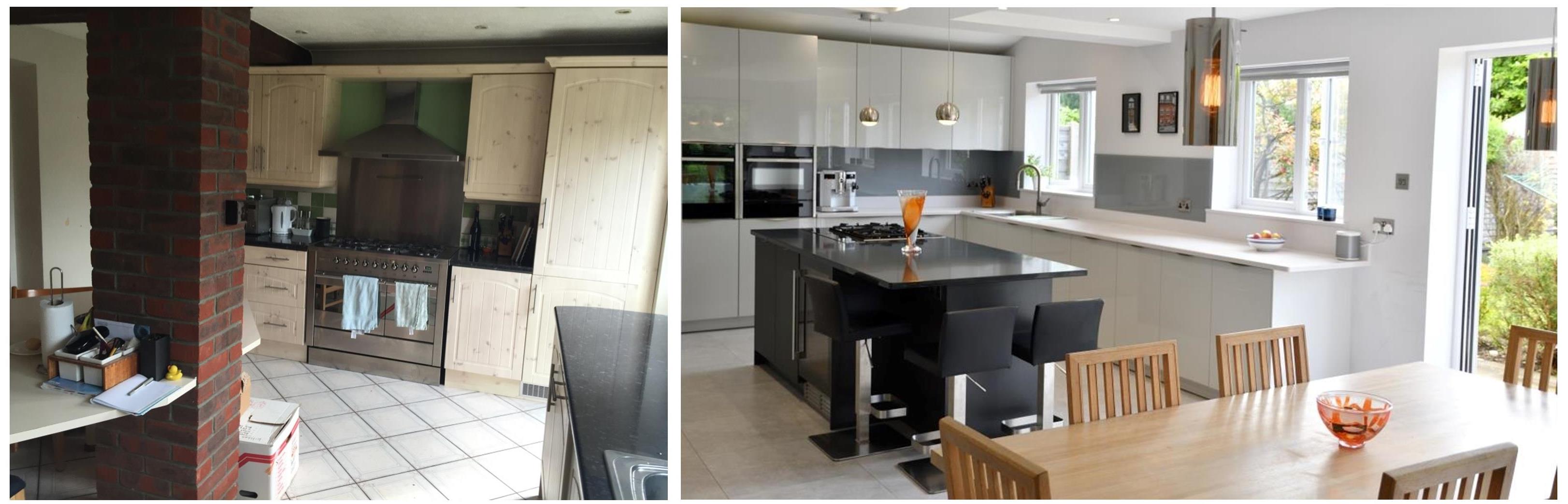 Our client has tastefully decorated this new space in cool, neutral grey and white tones which are complimented by chrome appliances, glossy kitchen units and glass splashbacks, giving an overall impression of space and style. Natural light fills the new kitchen through the enlarged windows & doors and light bounces off the reflective surfaces.