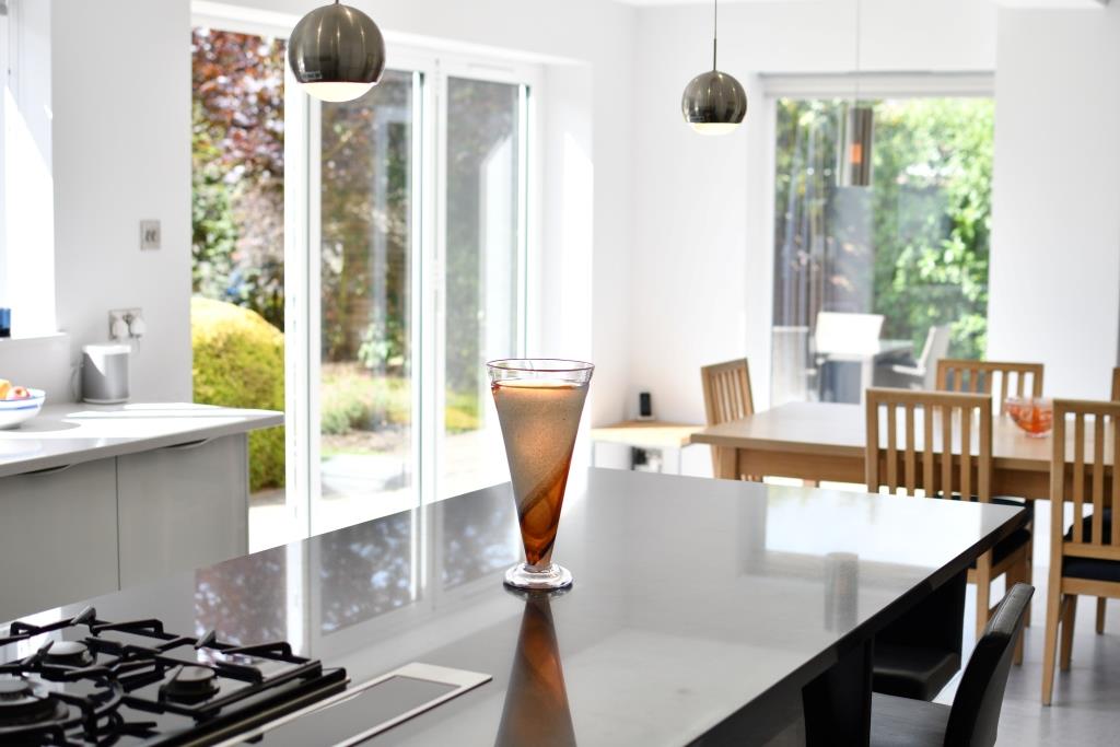 Our team created a clever contemporary design, which delivered a bright, spacious open-plan kitchen dining space with bi-folding doors opening out onto the garden and patio. The layout has been reconfigured maximising the room with the emphasis on usable design, with everything efficiently ordered and within arm’s reach. Our client specifically wanted a kitchen island with inset hob and extensive worktop space to enable cooking to be a shared family experience.
