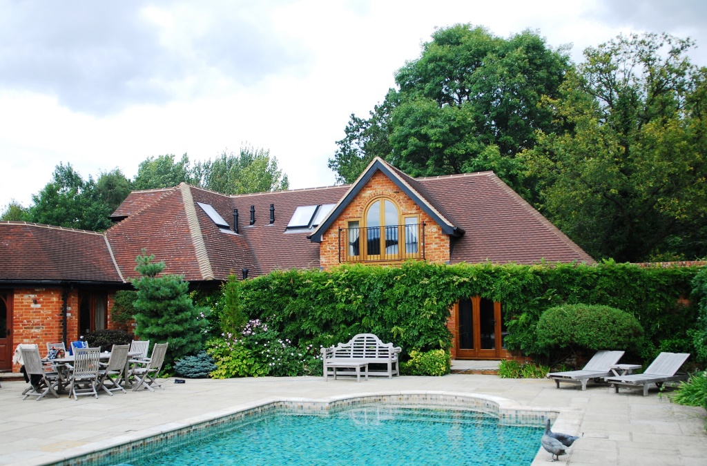Extension and remodelling to a prestigious house in Surrey comprising an extension attached to/over an existing garage to create a separate guest suite over a large family/media room.